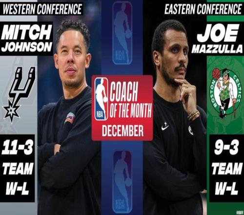 北京时间今日,NBA官方公布了12月最佳教练,马刺主帅米奇-约翰逊和凯尔特人主帅乔-马祖拉当选。