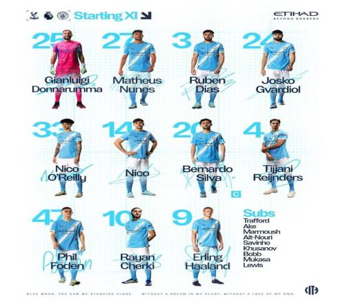 曼城首发:25-多纳鲁马、27-马特乌斯-努内斯、3-鲁本-迪亚斯、24-格瓦迪奥尔、33-尼科-奥赖利、14-尼科-冈萨雷斯、20-伯纳多-席尔瓦、4-赖因德斯、47-福登、10-谢尔基、9-哈兰德